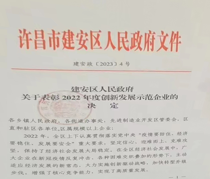 許昌恒生制藥有限公司被選入2022年度創(chuàng)新發(fā)展示范企業(yè),2023年01月31日受到許昌市建安區(qū)政府表彰。